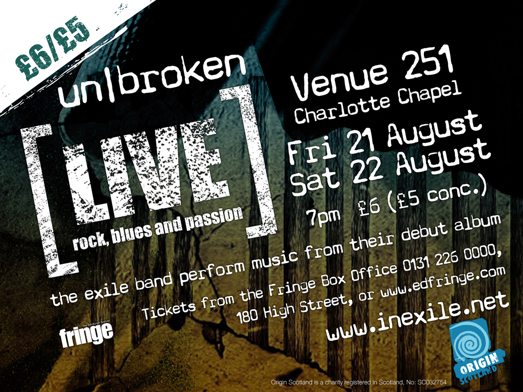 In May 2009, the Exile Band launched it's first album - un|broken. Here, for the first time, the opportunity to hear live most of the original tracks from the album, performed as part of the Edinburgh Festival Fringe.