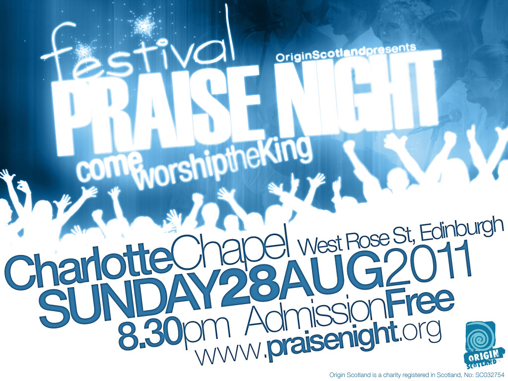 The Festival Praise Night has been a regular event at the Edinburgh Fringe since 2003 and is to be held at Charlotte Chapel in the heart of the new town - Edinburgh's Rose Street, just below the Castle.