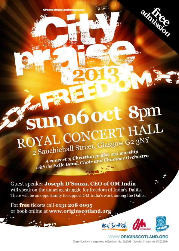 After the last sell-out City Praise in Glasgow in 2010, we return to the Concert Hall with a new event, this time in partnership with OM. Guest speaker Joseph D'Souza, CEO of OM India will speak on the amazing struggle for freedom of India's Dalits.