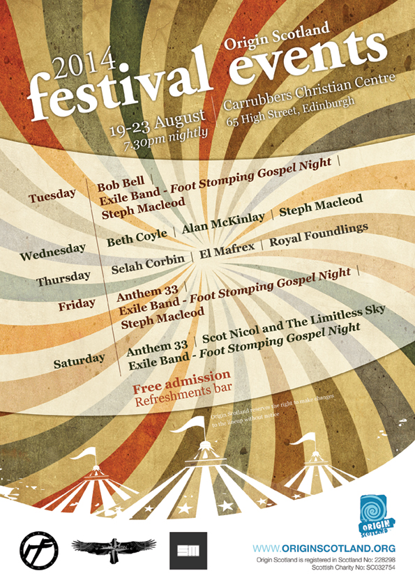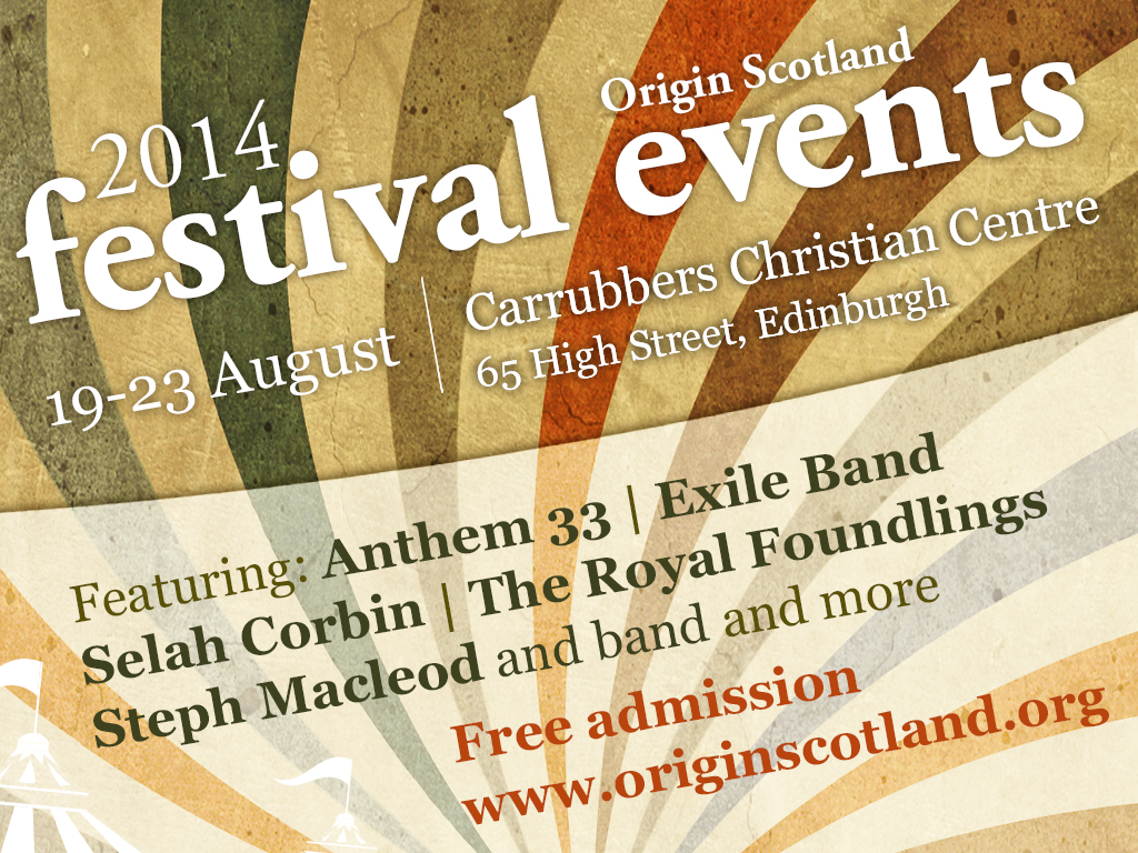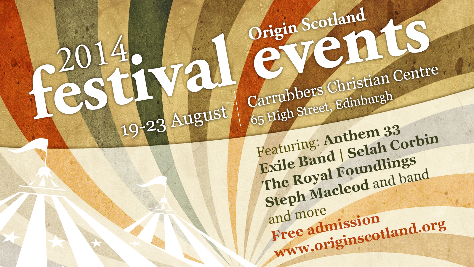 Origin Scotland presents our Festival outreach programme at Carrubbers Christian Centre, on Edinburgh's Royal Mile from 19-23 August. Come and hear some of Scotland's best Christian musicians sing their songs and tell their stories.