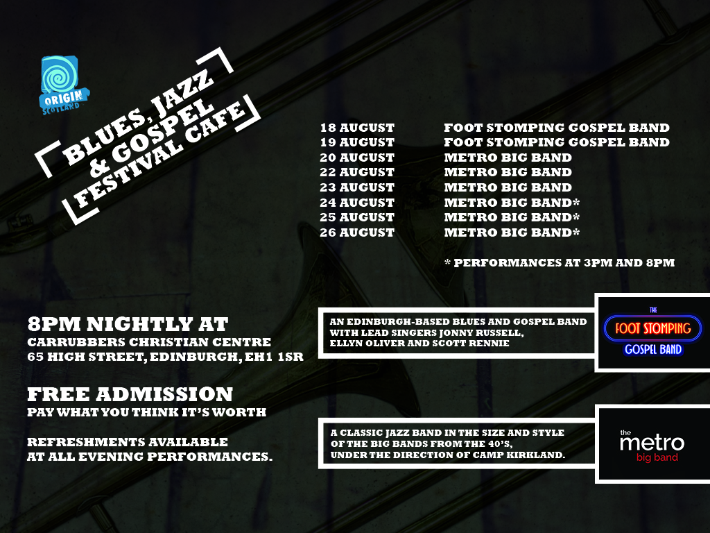 Join Origin's Foot Stomping Gospel Band for an evening of fantastic blues and Gospel music.