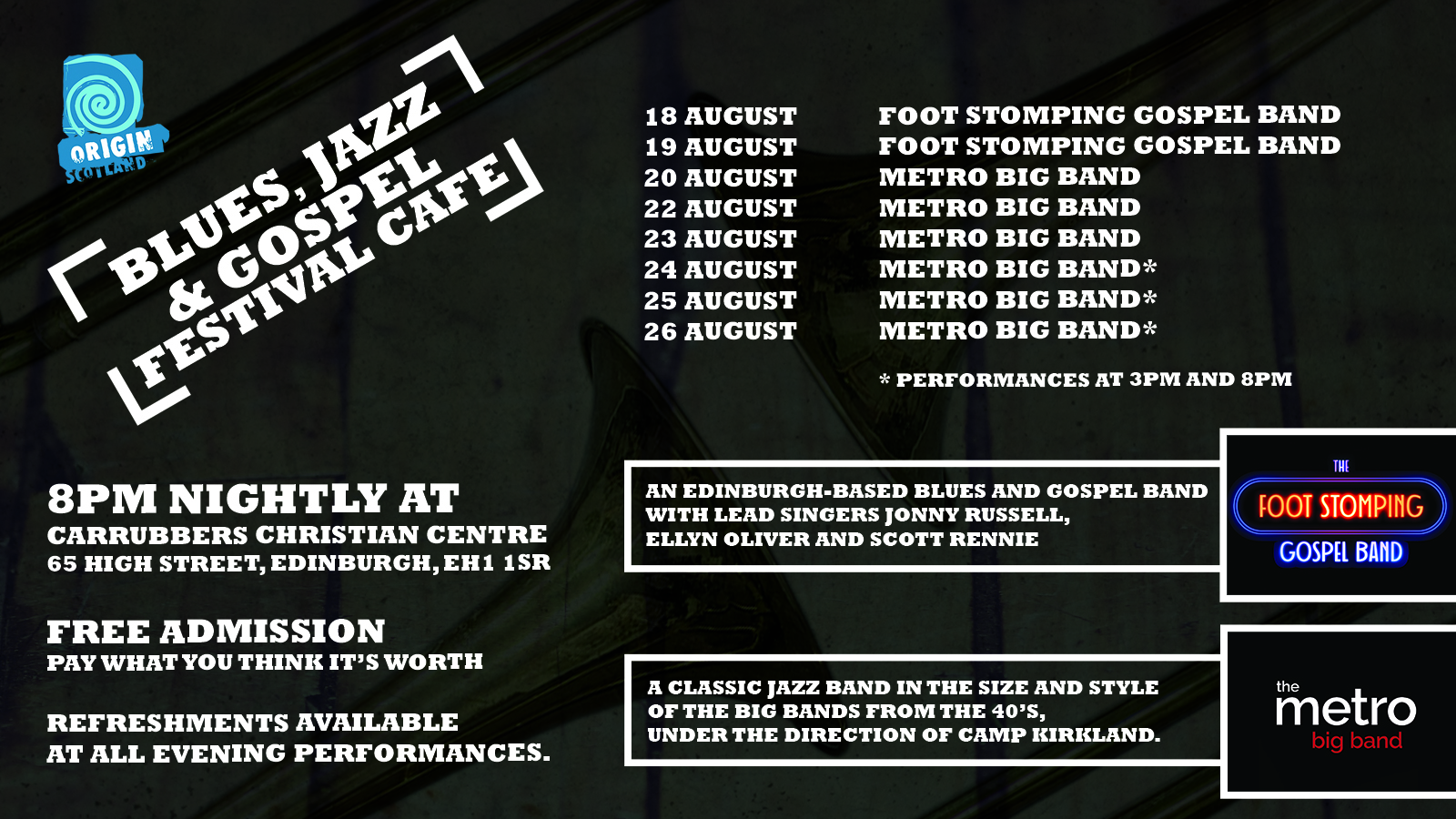 Metro Big Band is a classic jazz big band from the USA, directed by Camp Kirkland. They have travelled extensively through Europe and North and South America. Band members are professional musicians, many in the teaching and recording industry, from all over the United States.